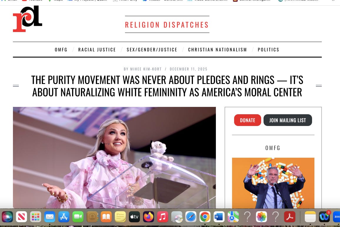 The best part of putting your ideas out into the world is seeing other people interact with them and push the conversation further. Pastor, author, and theologian, Mihee Kim-Kort draws connections to the MAGA movement in her article at Religion Dispatches, The Purity Movement Was Never About Rings—It Was About Naturalizing White Femininity As America’s Moral Center
